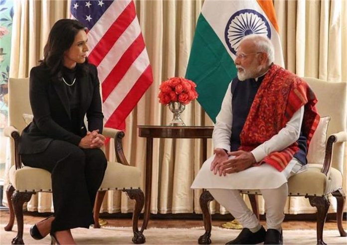 प्रधानमंत्री नरेंद्र मोदी ने अपनी फ्रांस यात्रा के बाद 12 फरवरी को वाशिंगटन डीसी पहुंचने के बाद, अमेरिकी इंटेलिजेंस डायरेक्टर तुलसी गबार्ड से मुलाकात की। पीएम मोदी का वाशिंगटन पहुंचने पर एयरपोर्ट पर भव्य स्वागत हुआ, जिसके बाद वह अपने ठहरने के स्थान ब्लेअर हाउस पहुंचे। यहां भी प्रवासी भारतीयों ने उनका जोरदार स्वागत किया। लेकिन उनके दौरे की शुरुआत अमेरिकी इंटेलिजेंस डायरेक्टर तुलसी गबार्ड से मुलाकात से हुई। यह मुलाकात खास थी क्योंकि तुलसी गबार्ड की नियुक्ति हाल ही में सीनेट द्वारा की गई है, और वह अब अमेरिका की 18 इंटेलिजेंस एजेंसियों की प्रमुख बन गई हैं।
