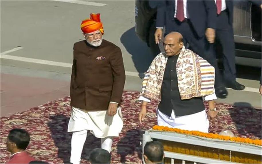 प्रधानमंत्री नरेंद्र मोदी ने रविवार को 76 वें गणतंत्र दिवस पर सफेद कुर्ता-पायजामा के साथ गहरे भूरे रंग का बंद गले का कोट और लाल-पीले रंग का साफा पहना तथा विशिष्ट अवसरों पर चमकीला व रंग-बिरंगा साफा पहनने की अपनी परंपरा को जारी रखा।