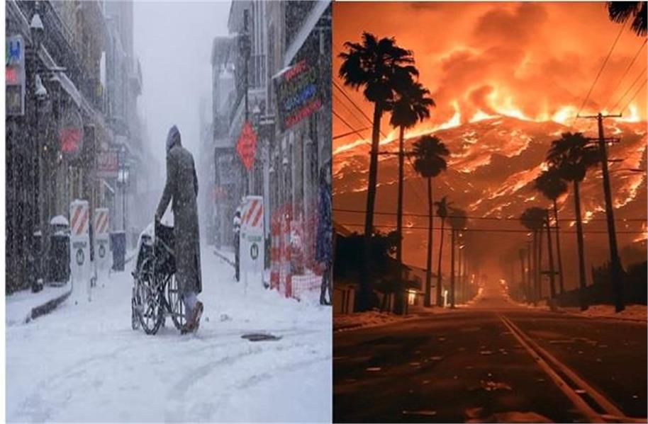 अमेरिका इन दिनों दो विपरीत लेकिन बेहद खतरनाक आपदाओं से जूझ रहा है। एक तरफ कैलिफोर्निया के जंगलों में लगी भीषण आग ने 10 हजार एकड़ से अधिक इलाका जला दिया है, तो दूसरी तरफ दक्षिणी राज्यों में बर्फीले तूफान ने जनजीवन को बुरी तरह प्रभावित किया है। दोनों घटनाओं ने हजारों लोगों को बेघर और असुरक्षित बना दिया है, जबकि आपातकालीन सेवाएं पूरी क्षमता से काम कर रही हैंअमेरिका के दक्षिणी राज्यों में बर्फीले तूफान ने तबाही मचा रखी है। मिसिसिपी, अलबामा, फ्लोरिडा, जॉर्जिया और लुइसियाना समेत कई राज्यों में इमरजेंसी घोषित कर दी गई है।