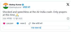 अक्षय कुमार ने एक्स पर पोस्ट करते हुए अहमदाबाद में हुए प्लेन क्रैश हादसे पर दुख जताया है. उन्होंने लिखा- ‘एयर इंडिया दुर्घटना से सदमें में हूं और हैरान हूं. इस समय सिर्फ प्रार्थना कर रहा हूं.’