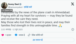 सनी देओल ने इस घटना पर दुख जताया और भगवान से प्रार्थना की है कि उनके परिवार वालों को इस बुरे समय से निपटने की ताकत दे. एक्स पर पोस्ट करते हुए उन्होंने लिखा- अहमदाबाद में हुए दर्दनाक विमान हादसे की खबर सुनकर दिल दुखी है और अब भी सदमे में हूं. मेरी संवेदनाएं सभी यात्रियों, उनके परिवारों और प्रभावित हुए सभी लोगों के साथ हैं. इस बेहद मुश्किल समय में मैं सभी के लिए दिल से प्रार्थना कर रहा हूं.