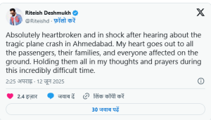 रितेश देशमुख ने लिखा- ‘अहमदाबाद में हुए विमान हादसे की दुखद खबर सुनकर मैं पूरी तरह से टूट गया हूं और सदमे में हूं. मेरी संवेदनाएं सभी यात्रियों, उनके परिवारों और जमीन पर प्रभावित सभी लोगों के साथ हैं. इस बेहद कठिन समय में मैं उन सभी के लिए प्रार्थना करता हूं.’