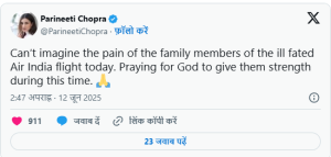 परिणीति चोपड़ा ने भी हादसे पर रिएक्ट किया है. उन्होंने पोस्ट में लिखा- ‘एयर इंडिया प्लेन में जो लोग थे उनकी फैमिली के दर्द की कल्पना भी नहीं की जा सकती. ईश्वर से प्रार्थना है कि वो इस मुश्किल समय में उन्हें सहने की शक्ति दे.’
