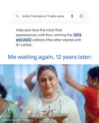 Champions Trophy 2025: गूगल इंडिया ने बॉलीवुड अंदाज में टीम इंडिया को चैंपियंस ट्रॉफी की बधाई दी. गूगल इंडिया के आधिकारिक ट्विटर हैंडल से कभी ख़ुशी कभी गम फिल्म से जया बच्चन का एक फोटो शेयर किया.चैंपियंस ट्रॉफी 2025 की शुरुआत टीम इंडिया ने बांग्लादेश के खिलाफ मैच के साथ कर दी है. भारत ने आखिरी चैंपियंस ट्रॉफी का खिताब 2013 में जीता था. करोड़ों भारतीय प्रार्थना कर रहे हैं कि रोहित शर्मा की कप्तानी वाली टीम इंडिया 12 साल का इंतजार खत्म करें और चैंपियंस ट्रॉफी का खिताब जीत जाए. गूगल इंडिया ने भी अनोखे अंदाज में टीम इंडिया को चैंपियंस ट्रॉफी के लिए शुभकामनाएं दी है.