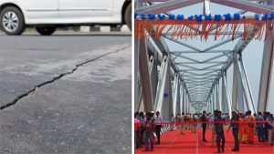 बिहार की राजधानी पटना में तीन दिन पहले मुख्यमंत्री नीतीश कुमार ने जेपी गंगा पथ (जेपी सेतु) का उद्घाटन किया था. लेकिन तीन दिनों के भीतर ही इस पुल में बड़ी-बड़ी दरारें नजर आ रही हैं. इस घटना का वीडियो सामने आया है, जिसमें ब्रिज पर आई दरारों को साफ देखा जा सकता है.पटना के जेपी गंगा पथ को 3831 करोड़ रुपये की लागत से तैयार किया गया था. तीन दिन पहले ही मुख्यमंत्री नीतीश कुमार ने इसका उद्घाटन किया था. यह दरारें दीदारगंज के पास पुल के पिलर नंबर A-3 के पास नजर आ रही हैं. यह दरारें ब्रिज की दोनों लेन में नजर आ रही है.