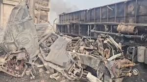 नूंह जिले के तावडू उपमंडल में KMP एक्सप्रेसवे पर रविवार सुबह पांच भारी वाहनों की टक्कर से भीषण हादसा हुआ. रोड़ी से लदा डंपर और अमेजन का कंटेनर आग की चपेट में आ गए, जिससे डंपर चालक और परिचालक की जिंदा जलकर मौत हो गई. कंटेनर में भरा करीब सवा करोड़ रुपये का सामान जल गया. हादसे से छह किलोमीटर जाम लगा, जिसे चार घंटे बाद बहाल किया गया.