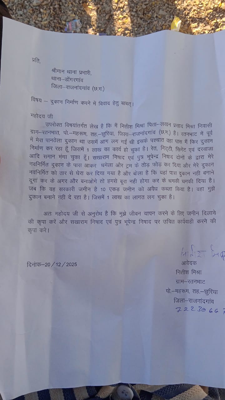 इसकी शिकायत नीतीश मिश्रा निवासी रतनभाट ने डोंगरगांव थाना एवं तहसीलदार से भी किया है एवं न्याय दिलाने की मांग किया है नीतीश मिश्रा ने इस संवाददाता को बताया कि वह रतन भाट का निवासी है और बस स्टैंड में उनकी छोटी सी दुकान है जिसे कुछ कुछ असामाजिक तत्व द्वारा तोड़ दिया गया था जिसे पुनः निर्माण के लिए वह रां मटेरियल मंगाया हुआ था लेकिन पास में ही लगभग 10 एकड़ जमीन कब्जा कर चुके गांव के ही सखाराम निषाद एवं उनके पुत्र भूपेंद्र निषाद के द्वारा जबरदस्ती उसके दुकान में कांटा का घेरा कर दिया गया है और उन्हें धमकी चमकी लगाया जा रहा है की दुकान निर्माण करोगे तो ठीक नहीं होगा संभवतः दुकान में तोड़फोड़ उन्होंने किया होगा नीतीश मिश्रा ने शासन प्रशासन से आग्रह किया कि वह एक आम व्यक्ति है और छोटे से दुकान ही उनके जीवन यापन का साधन है कृपया इस जगह पर दुकान निर्माण करने की परमिशन दिया जाए व तोड़फोड़ करने वाले लोगों पर उचित कार्रवाई हो