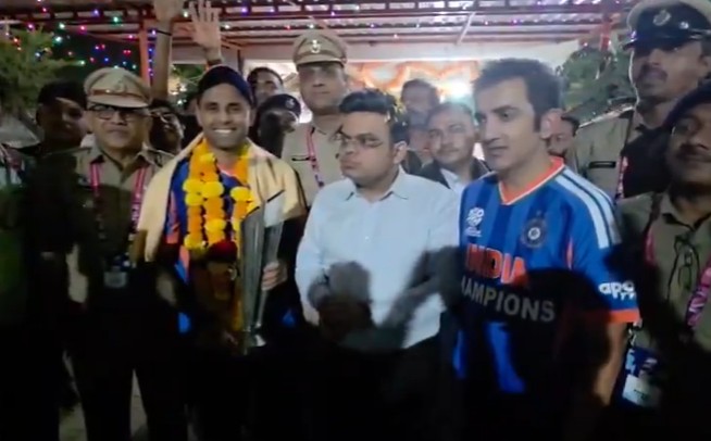 Sports : अहमदाबाद में जीत का जश्न मानते हुआ, वर्ल्ड कप ट्रॉफी लेकर सूर्यकुमार यादव, गंभीर और जय शाह पहुंचे हनुमान मंदिर