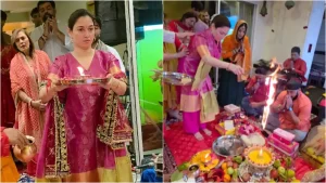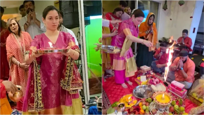 एक्ट्रेस तमन्ना भाटिया इन दिनों अपनी लव लाइफ को लेकर सुर्खियों में बनी हुई हैं. वो नवरात्रि बहुत धूमधाम से मना रही हैं. उनके घर माता की चौकी रखी गई थी. एक्ट्रेस तमन्ना भाटिया अपने ब्रेकअप को लेकर सुर्खियों में बनी हुई हैं. रिपोर्ट्स की माने तो तमन्ना और विजय वर्मा अलग हो गए हैं. कई सालों तक डेट करने के बाद दोनों की राहें अलग हो गई हैं हालांकि दोनों में से किसी ने अभी तक इस पर चुप्पी साधी हुई है. इसी बीच नवरात्रि के पहले दिन तमन्ना भाटिया ने अपने घर माता की चौकी रखी थी. माता की चौकी में तमन्ना भेटों पर झूमती हुईं नजर आईं.