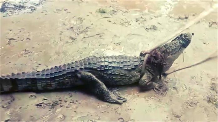 रेस्क्यू ऑपरेशन के जरिए पकड़ लिया गया मगरमच्छ