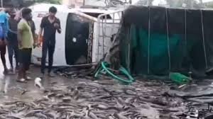 UP : ट्रक पलटा और सड़क पर गिर गईं हजारों मछलियां, मच गई लूट…..