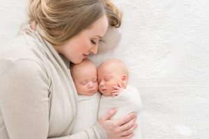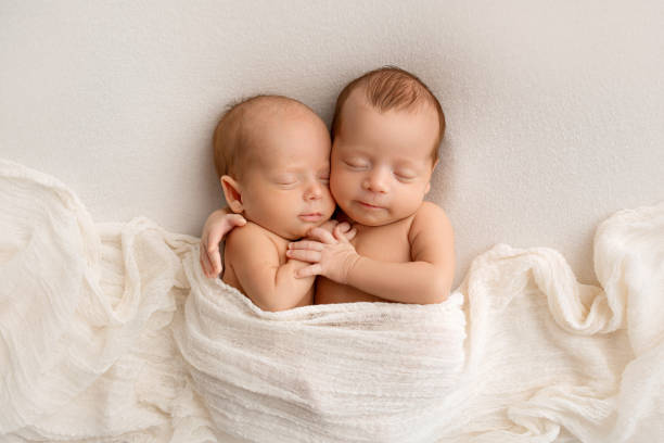 Tiny newborn twins boys in white cocoons on a white background. A newborn twin sleeps next to his brother. Newborn two twins boys hugging each other. Professional studio photography.